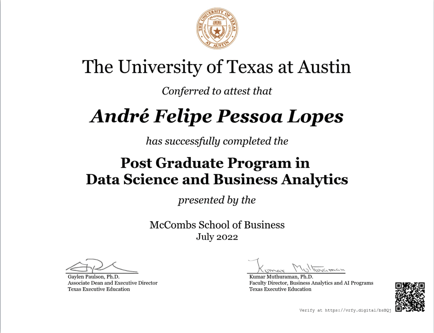 Para aprofundar minha expertise técnica e estratégica, fiz uma pós-graduação em Data Science & Business Analytics na University of Texas at Austin. O programa, focado em aplicações práticas e liderado pela McCombs School of Business, me equipou com ferramentas de tomada de decisão baseada em dados. Com 12 projetos práticos e mentorias semanais com especialistas, consolidei conhecimentos em estatística e modelos preditivos, habilidades que me capacitaram a traduzir insights técnicos em valor estratégico para o negócio.