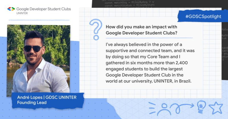 Durante dois anos tive uma jornada transformadora como Google DSC Lead, onde fundei e liderei o maior Google Developer Student Club do mundo, uma comunidade com mais de 5.000 membros.