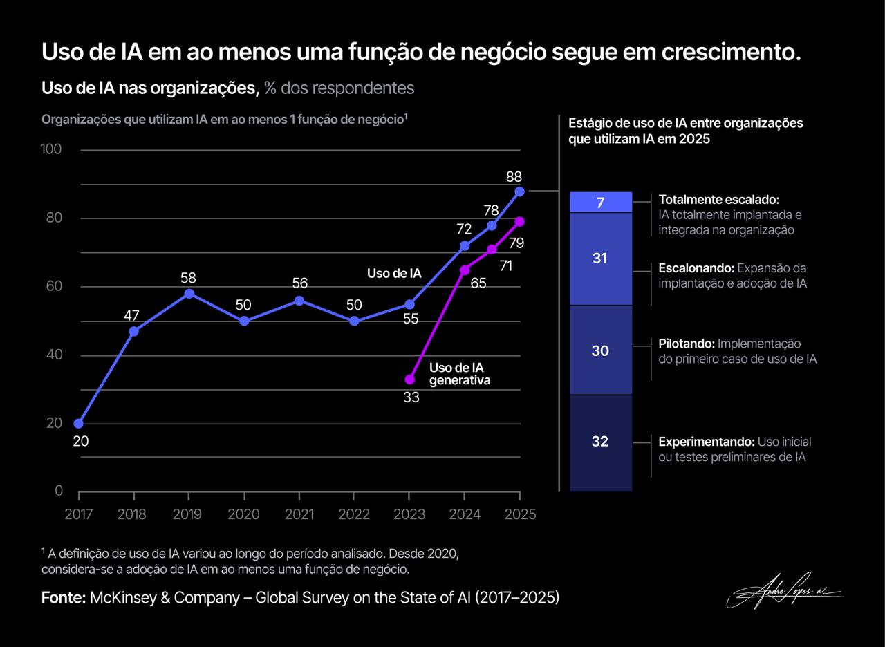 E ela não é mentira. A adoção realmente explodiu. O levantamento global da McKinsey, "The state of AI in 2025: Agents, innovation, and transformation", aponta que 88% dos respondentes dizem que suas organizações usam IA regularmente em pelo menos uma função, acima de 78% no ano anterior.