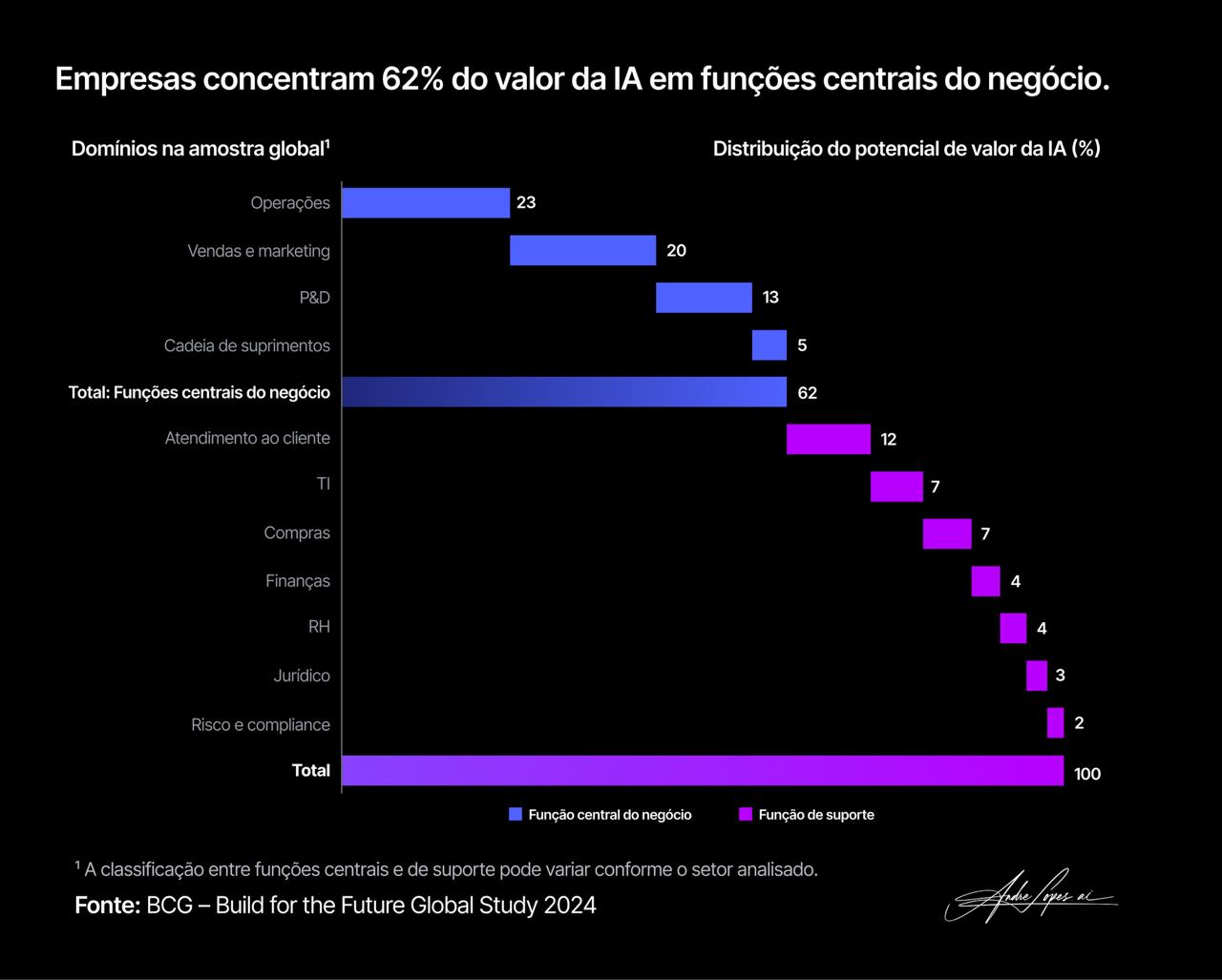 A BCG mostra que as empresas mais maduras em IA, os chamados de Líderes, geram 62% de todo o valor da IA diretamente em funções core do negócio, como: